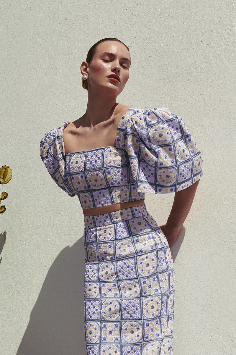 Precioso top corto confeccionado en un tejido bordado con estampado de cuadrados con lentejuelas en tonos beige y azules. (...)